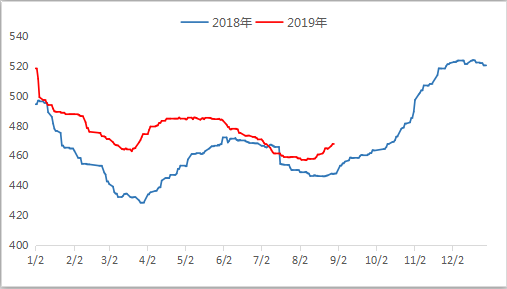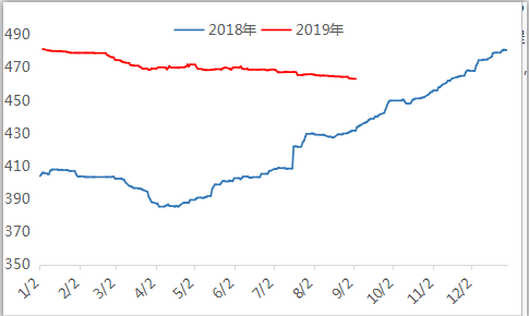 截止9月4日,水泥價(jià)格指數(shù)為468.05,較年初下降50.7點(diǎn),同比上漲19.88點(diǎn)。從圖1可以看出,2018-2019年前三季度整體走勢(shì)基本一致,仍然保持明顯的淡旺季之分,但是值得注意的是今年5-7月份之間快速回落,在7月底與2018年同期實(shí)現(xiàn)交叉,與往年同期較為平緩的走勢(shì)大相徑庭。也體現(xiàn)了全國(guó)水泥價(jià)格水平在高位開(kāi)局后,存在較大快速回落的風(fēng)險(xiǎn)。
