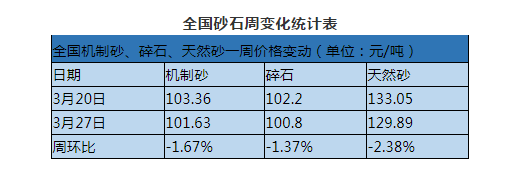 據(jù)中國(guó)砂石協(xié)會(huì)了解,近日,全國(guó)機(jī)制砂均價(jià)101.63元/噸,周環(huán)比下跌1.67%;碎石均價(jià)在100.8元/噸,周環(huán)比下跌1.37%;天然砂均價(jià)在129.89元/噸,周環(huán)比下跌2.38%。