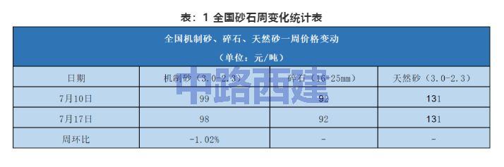 受暴雨水影響,長江流域水位上漲,下游多個省份處于抗洪階段,因此上周全國建筑施工進(jìn)度持續(xù)放緩,需求一般。珠三角地區(qū)有所好轉(zhuǎn),沿海港口發(fā)運(yùn)量小幅回升天然砂價(jià)格高位持穩(wěn)運(yùn)行,多地區(qū)機(jī)制砂產(chǎn)能釋放價(jià)格小幅回落,碎石價(jià)格暫無調(diào)整。截至07月17日,全國機(jī)制砂均價(jià)98元/噸,周環(huán)比下跌1.02%;碎石均價(jià)92元/噸,周環(huán)比持平;天然砂均價(jià)131元/噸,周環(huán)比持平。